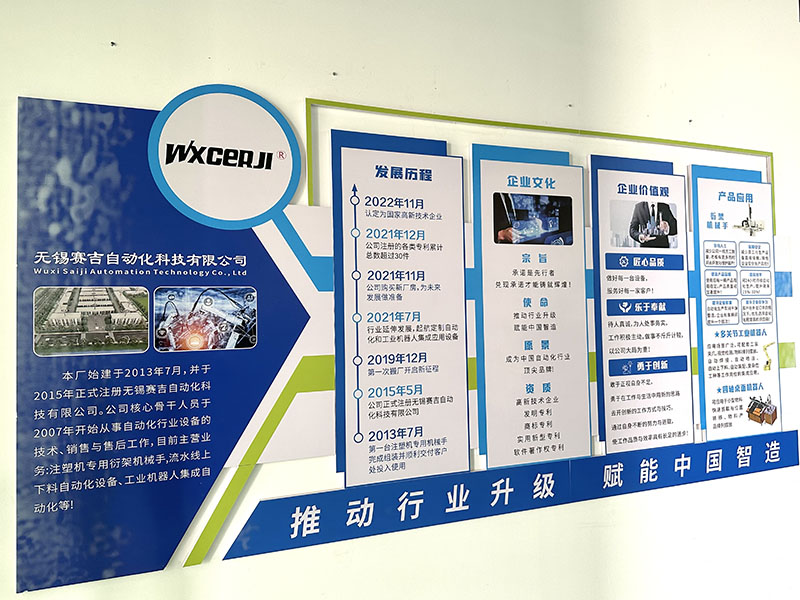 無錫賽吉自動化科技有限公司始建于2013年5月。公司幾位核心骨干人員在2007年到2009年分別入行從事注塑機專用機械手研發(fā)、設(shè)計、機電、組裝、銷售與售后工作,目前企業(yè)分別有三大塊經(jīng)營項目:自動化設(shè)備(數(shù)控車床、注塑機專用取件機械手為主)設(shè)計、生產(chǎn)、銷售與服務(wù)。
